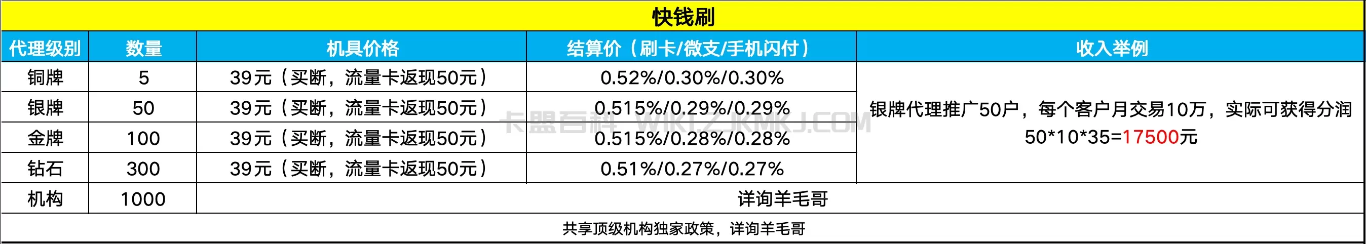 收益举例:银牌代理推广50台,客户交易10万,实际可获得分润收入17500元