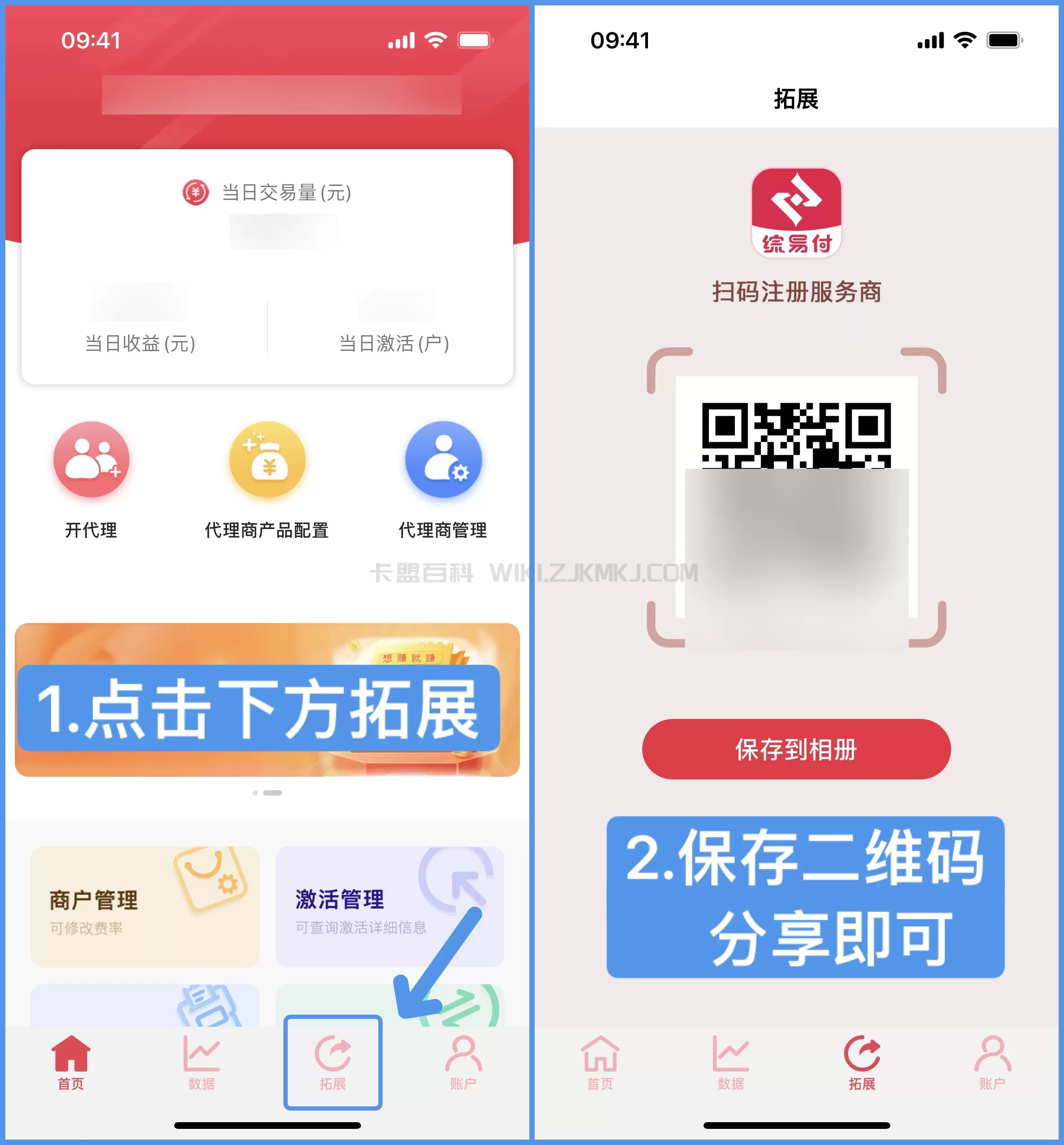 拓展代理:综易付APP-点击拓展-保存二维码分享给代理