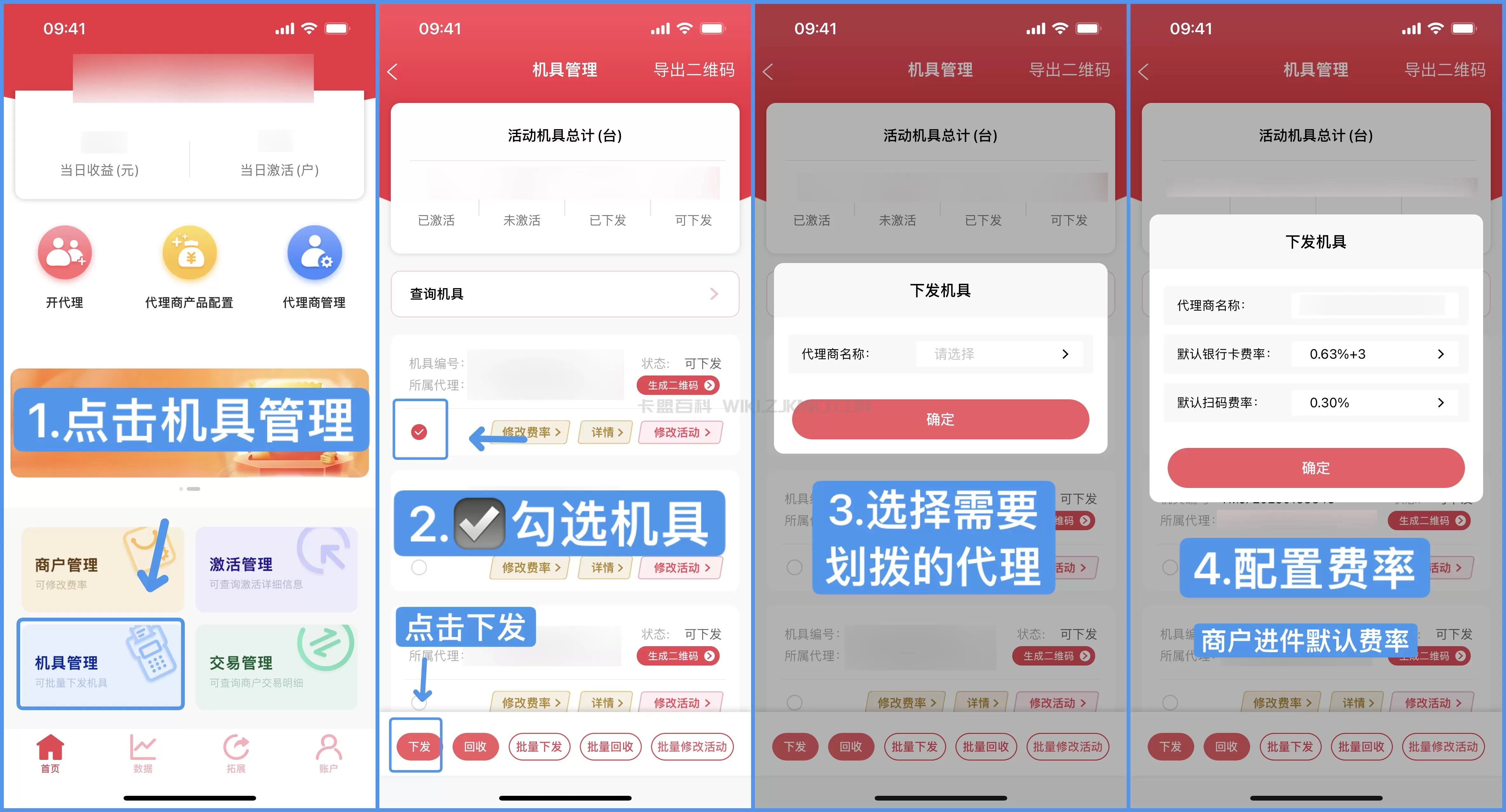 码牌划拨: 综易付APP-机具管理-勾选机具-下发-选择代理-配置费率