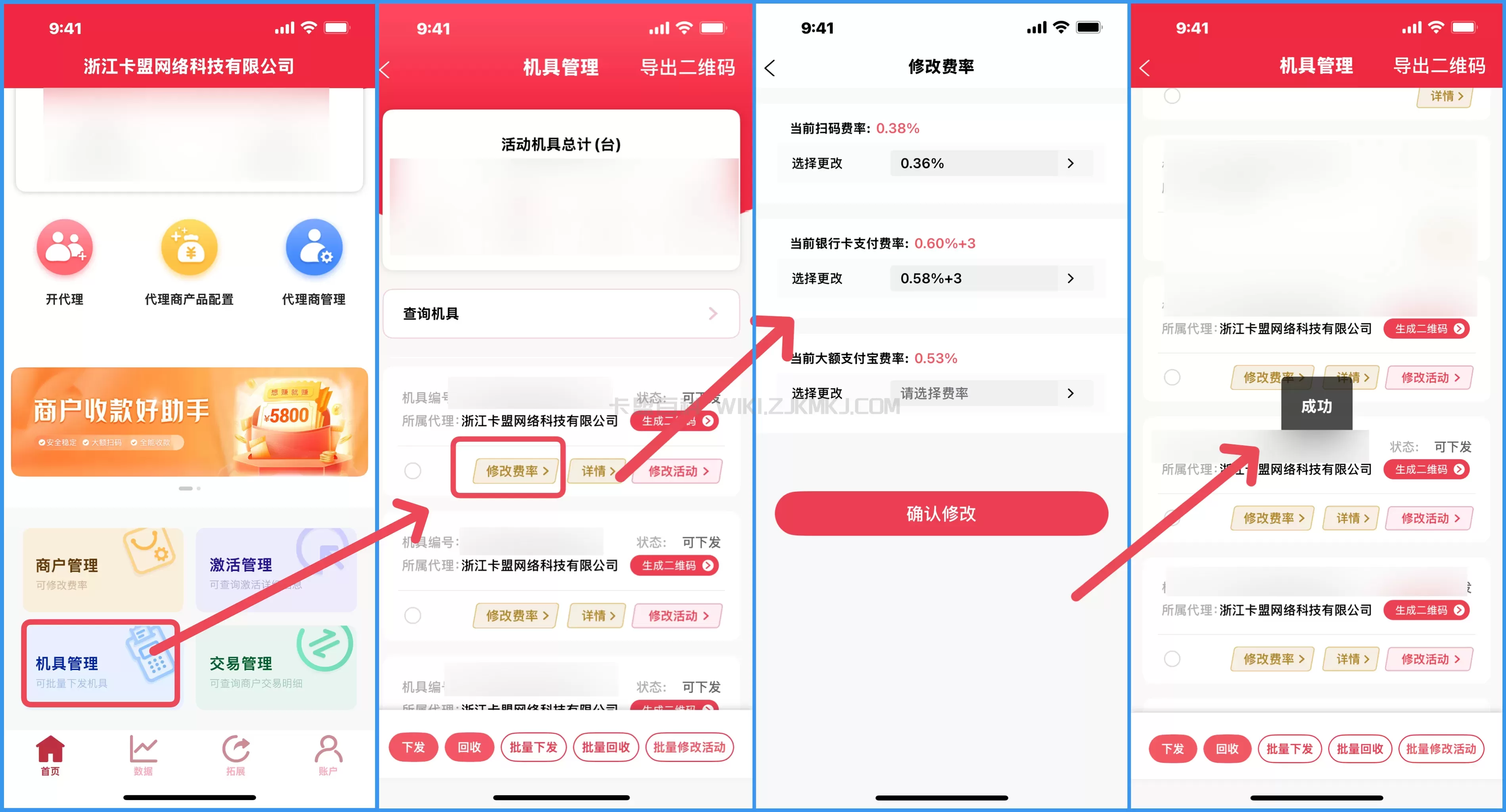修改费率: 综易付APP:商户管理-修改费率-成功