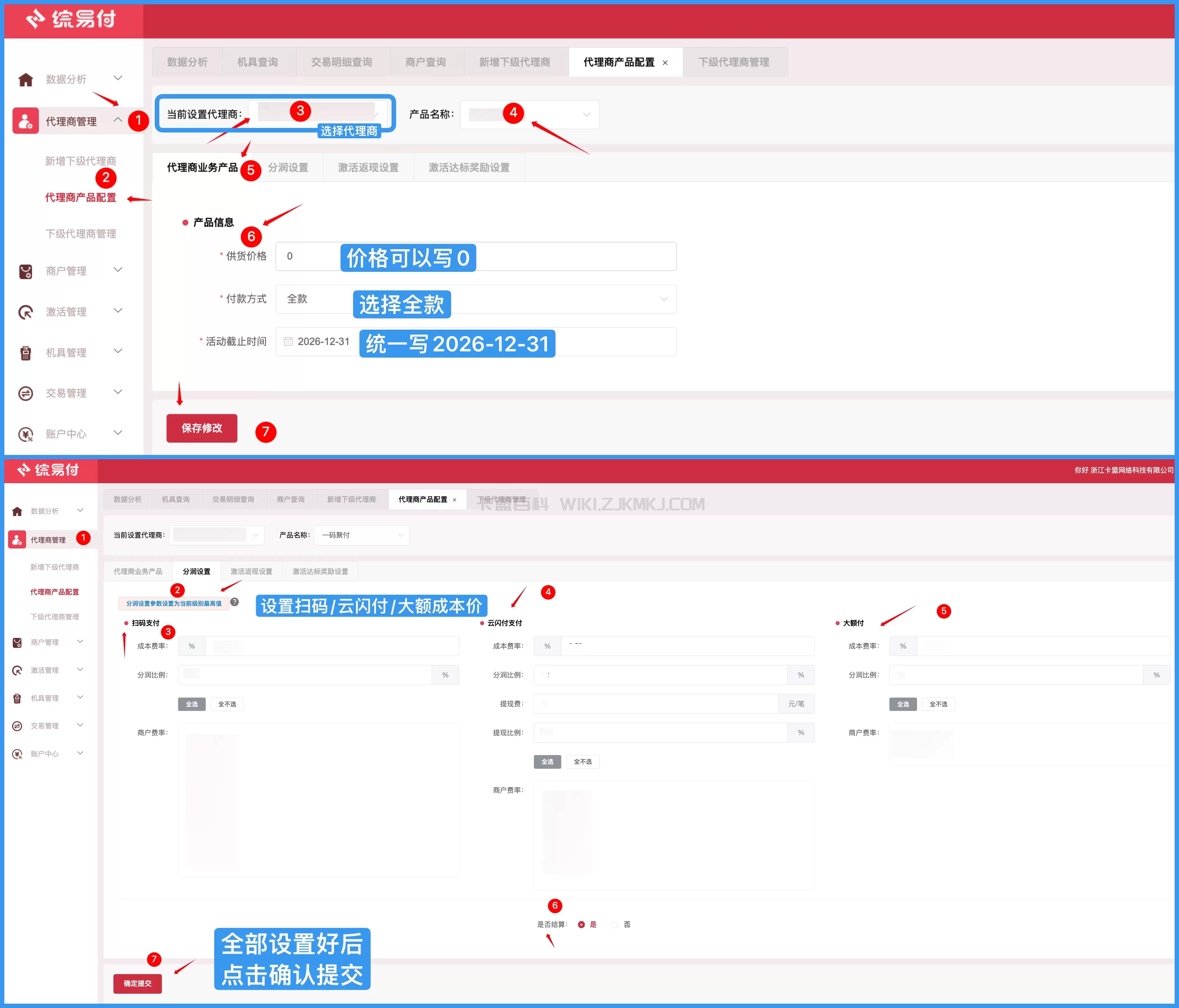 综易付电脑端:点击代理商管理-代理商产品配置-选择代理-填写信息-设置费率-确认提交