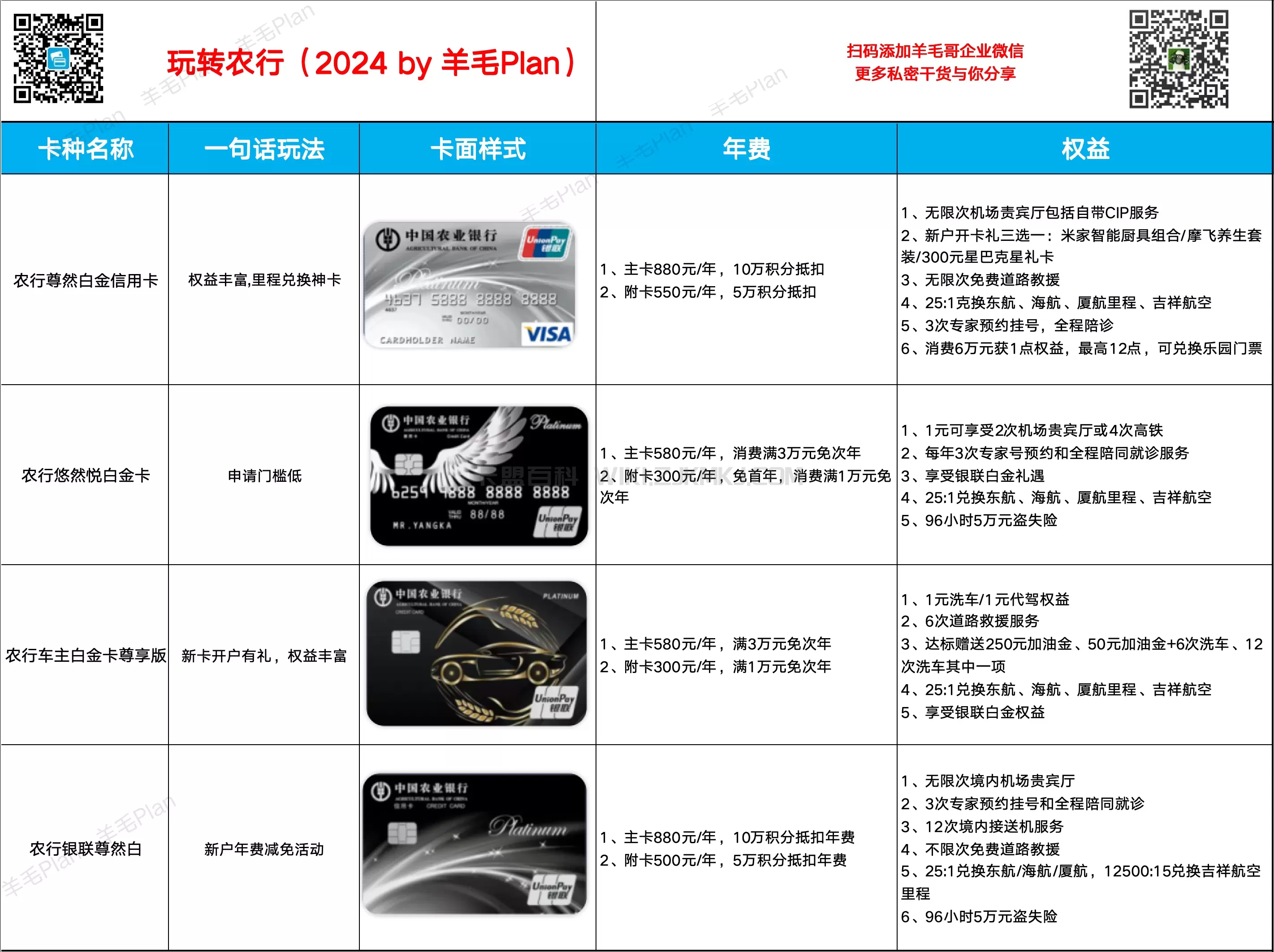 2024年农行新出白金卡,可以看作是银联版的精粹白,可以参加银联活动,比精粹白多一个10万积分可兑换接送机的权益,目前规则年费的持有成本高于精粹白。