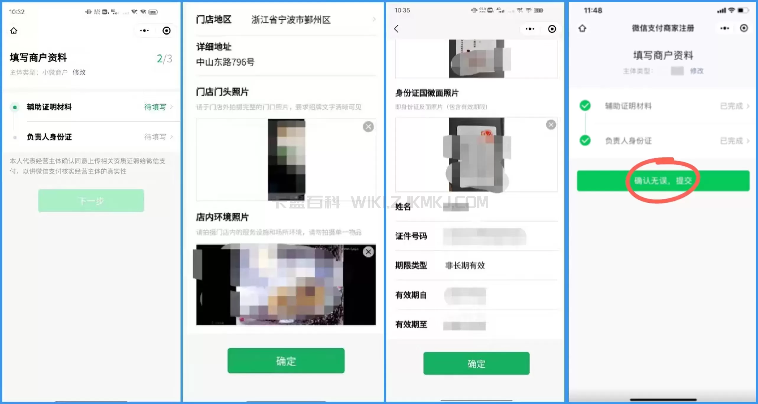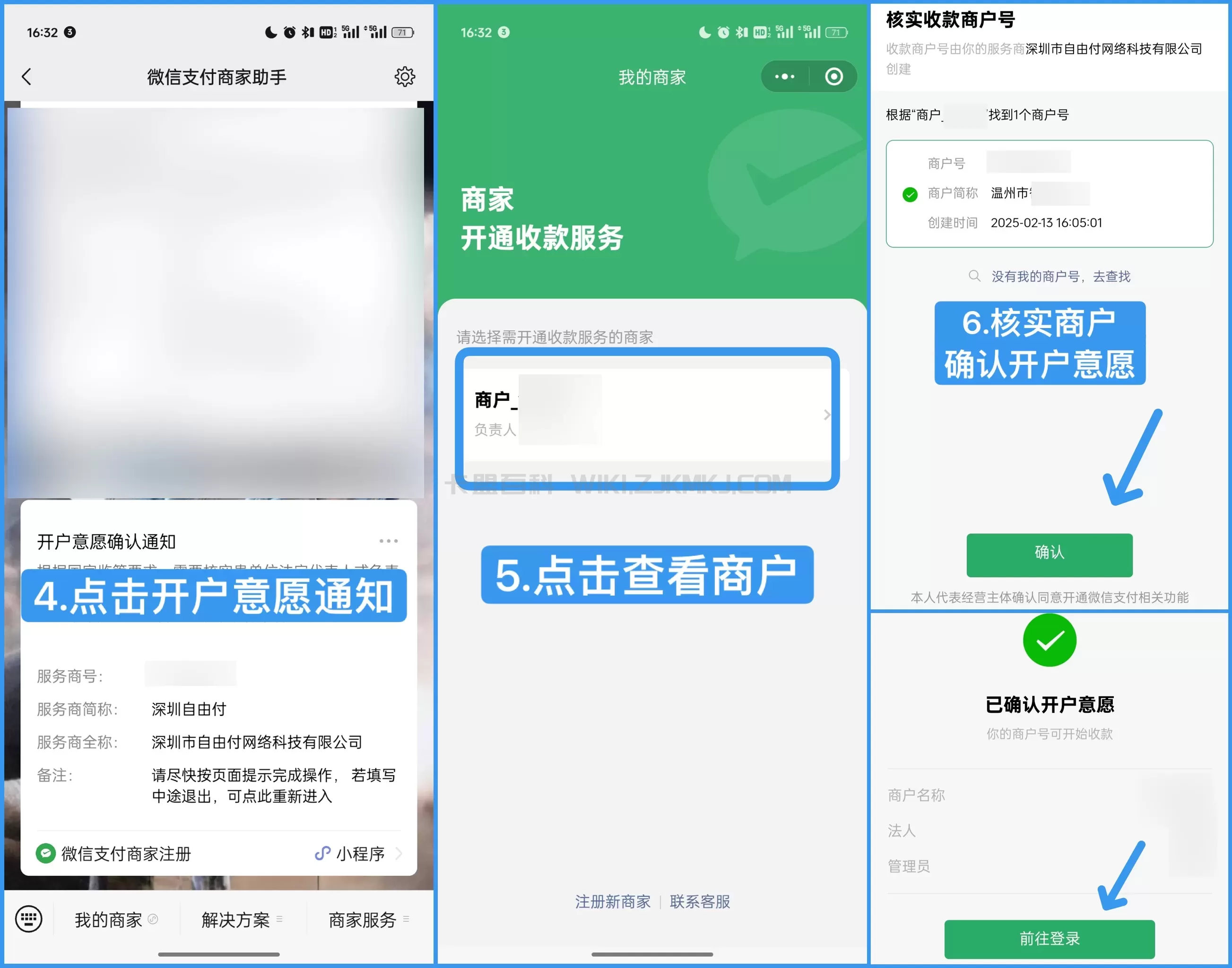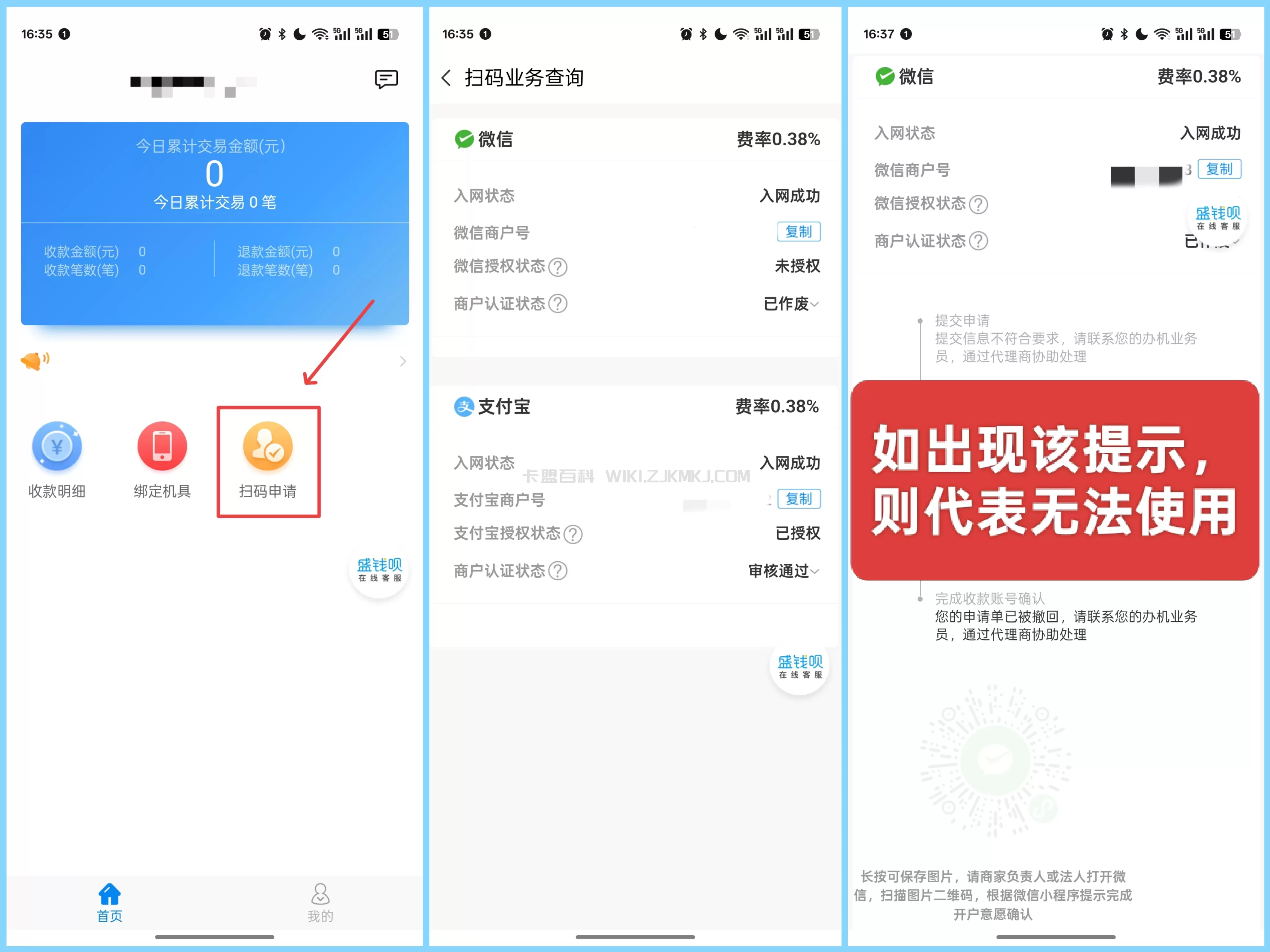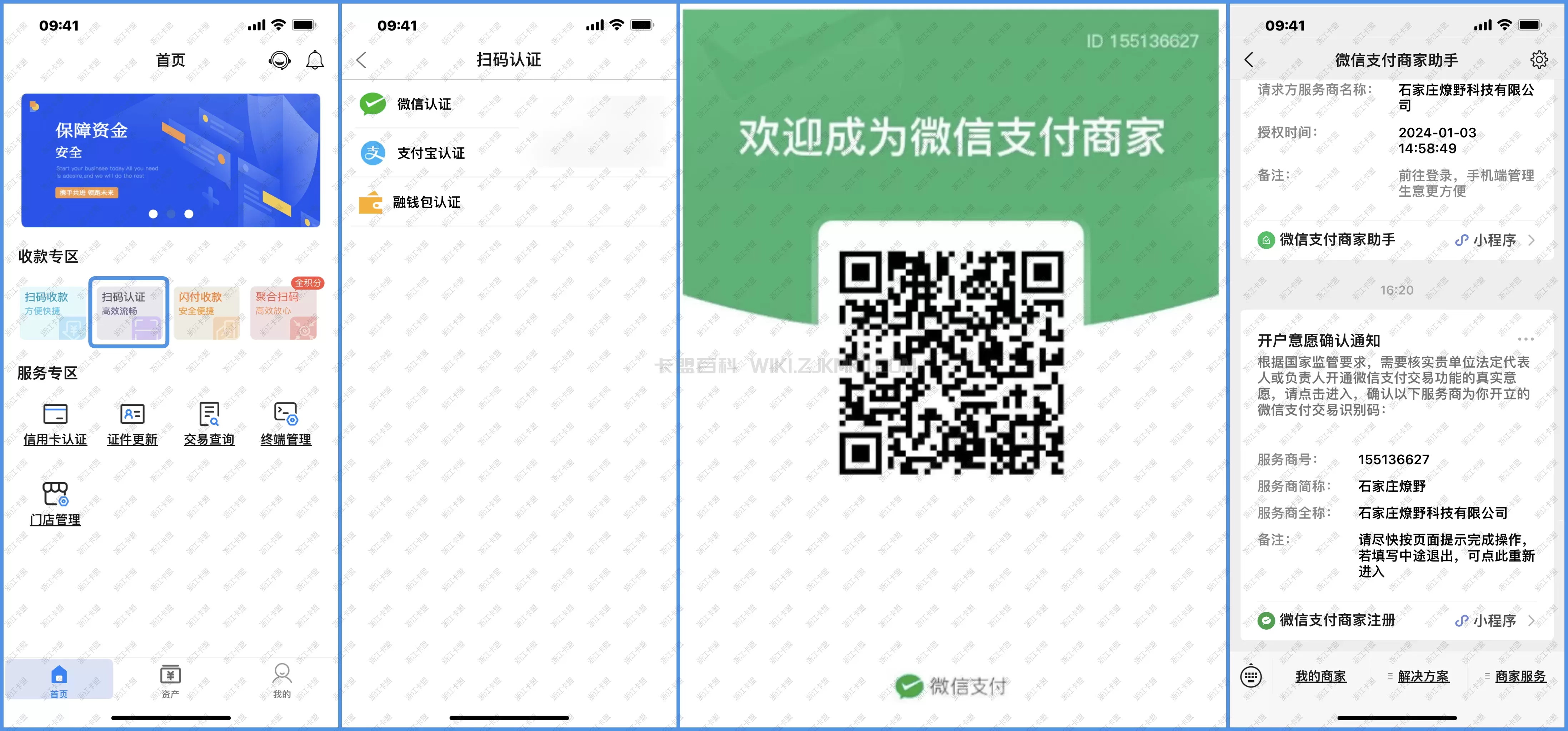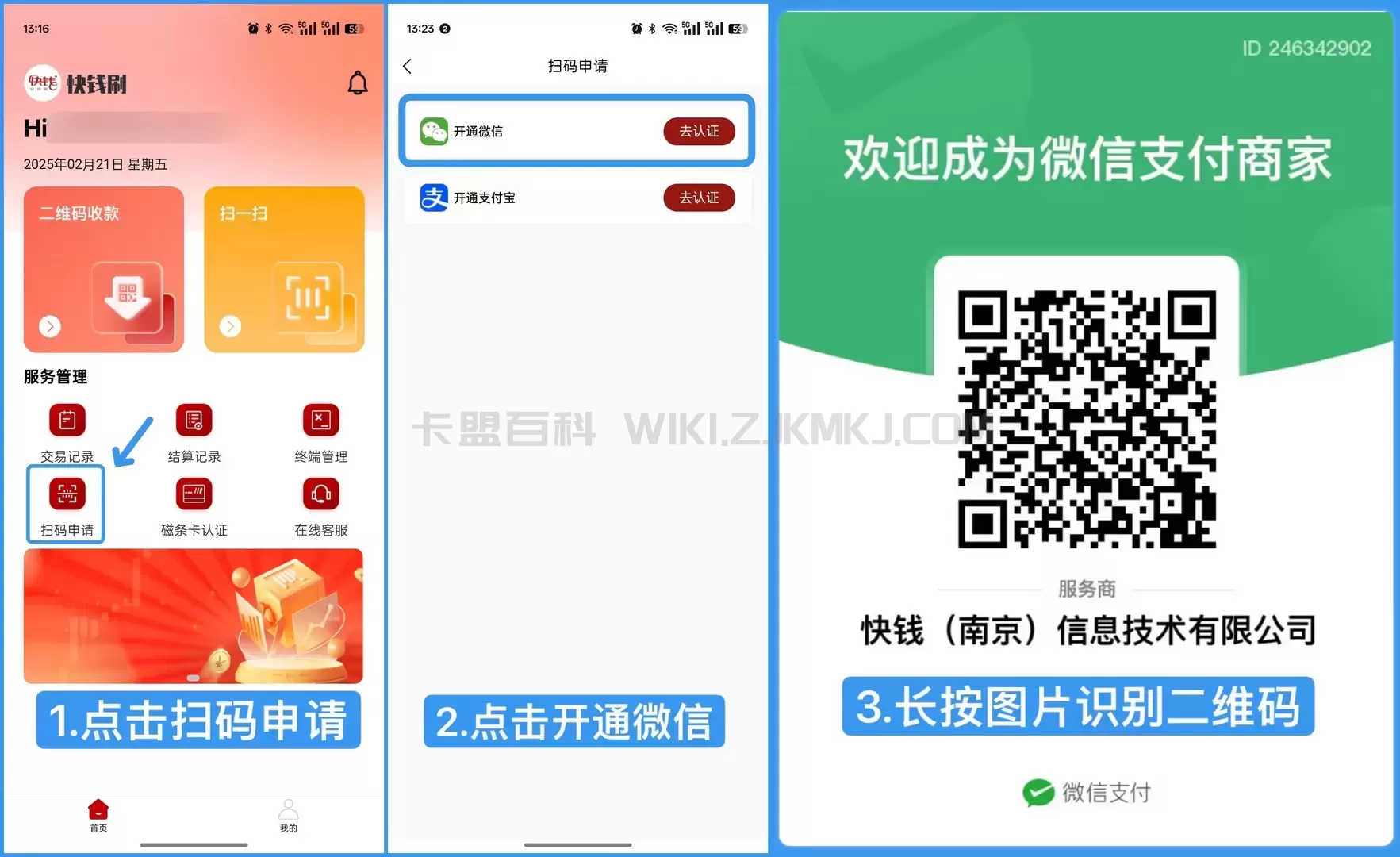 快钱刷APP-扫描申请-开通微信-长按图片识别二维码-进入微信支付商家助手公众号-点击开户意愿-核实商户,确认开户