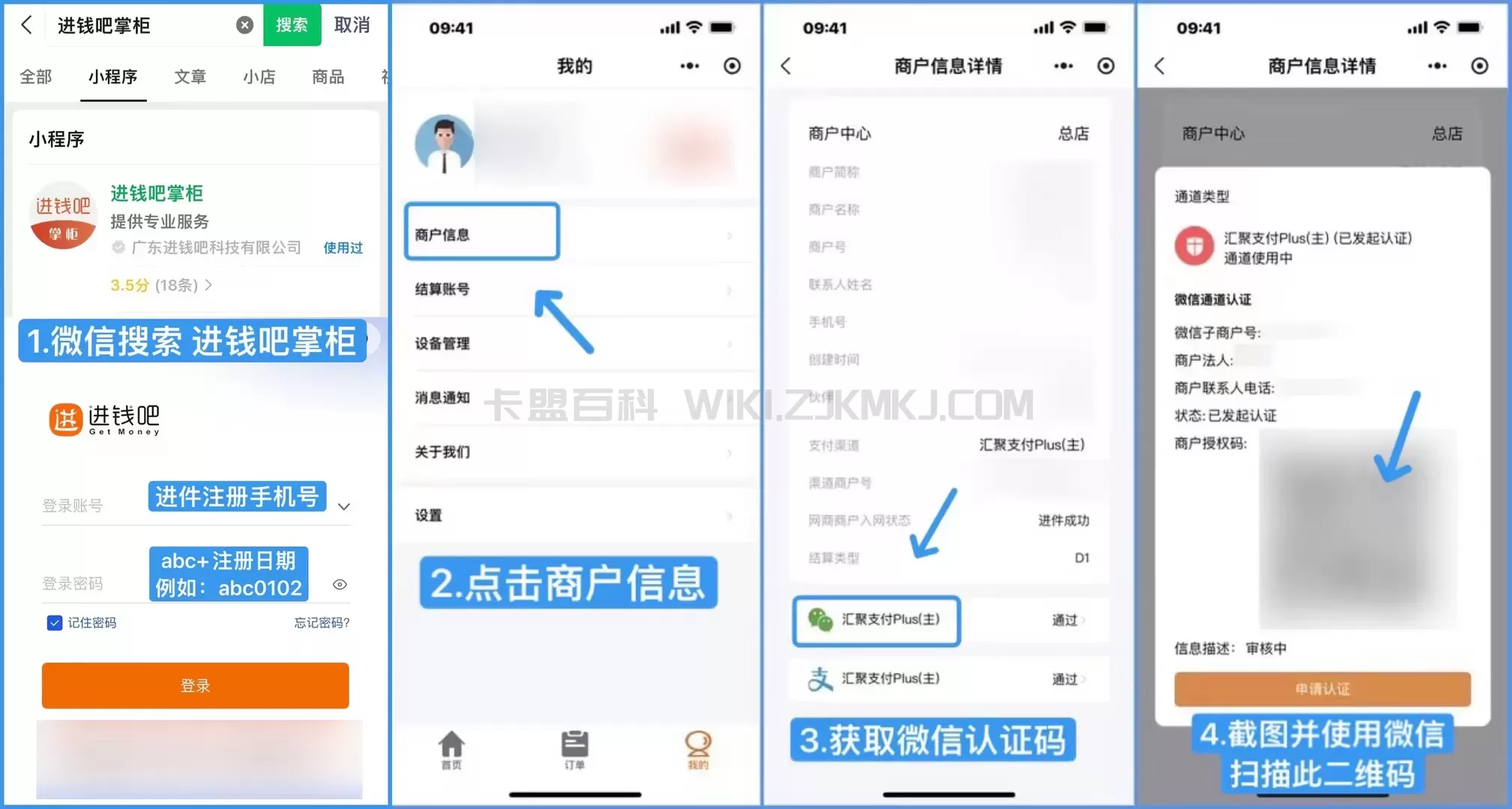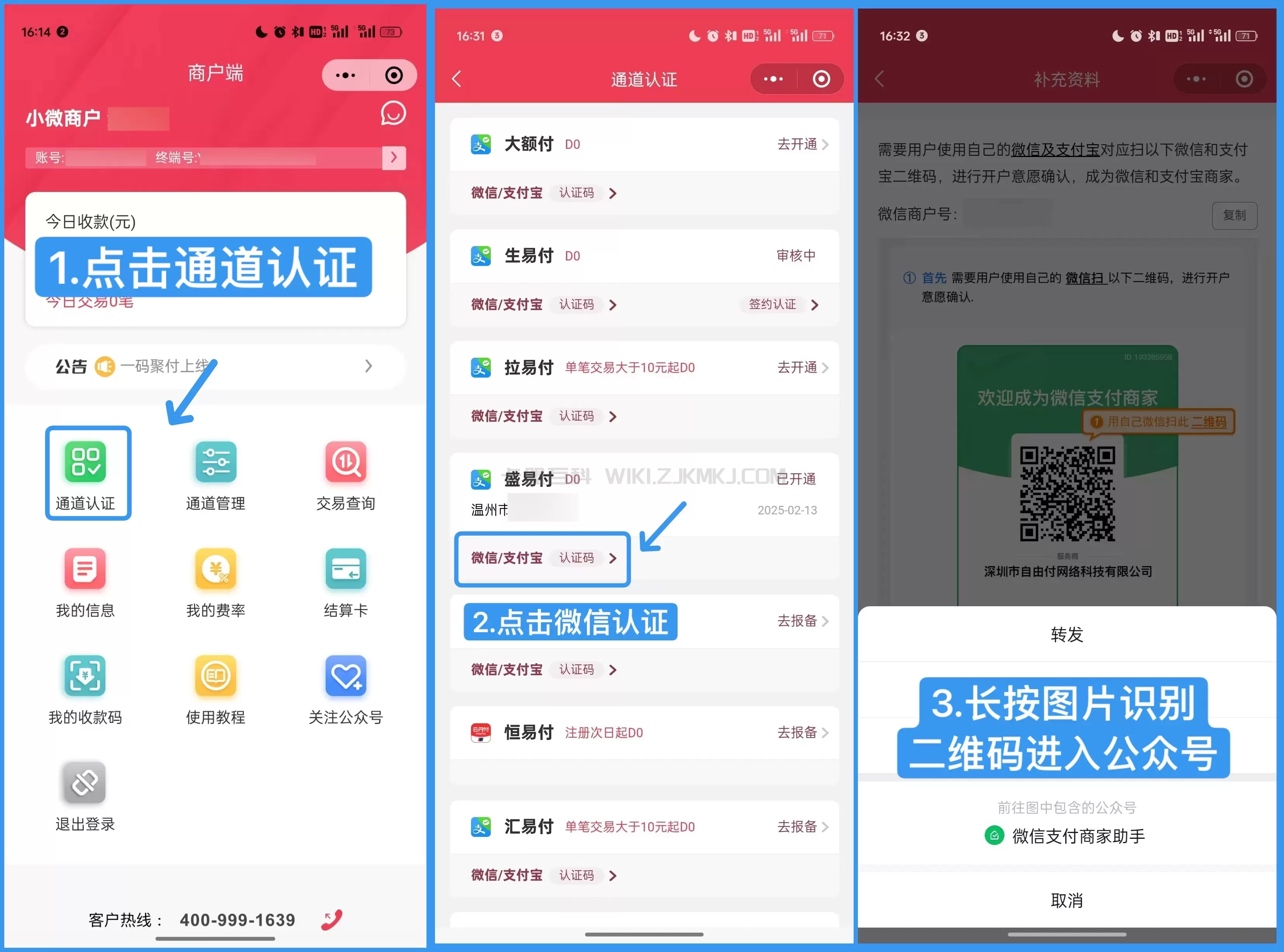 通道认证-微信认证码-长按图片识别二维码-进入微信支付商家助手公众号-点击开户意愿-核实商户,确认开户