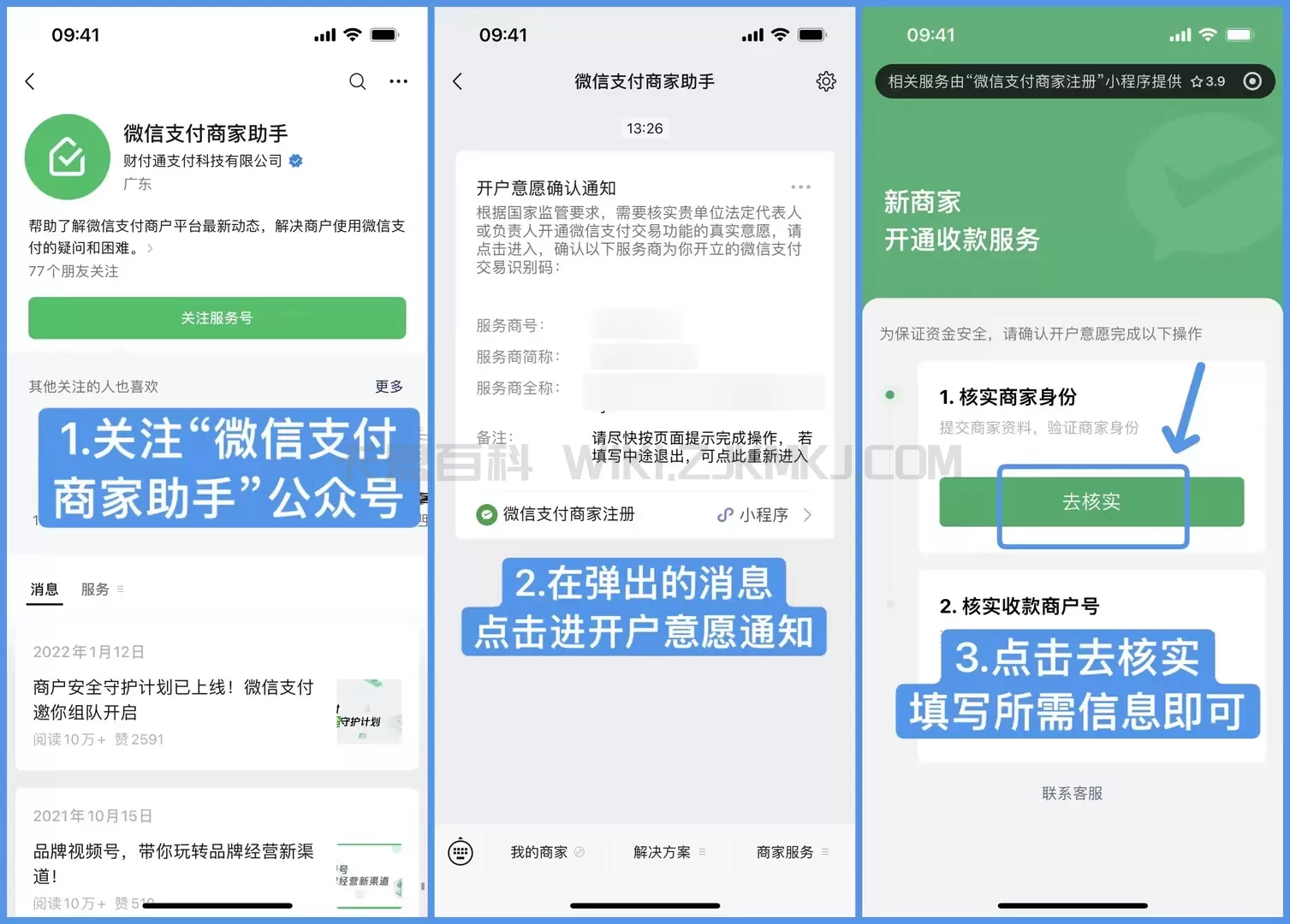 打开微信扫一扫,选择刚刚保存的二维码,关注微信支付商家助手公众号,在弹出的消息点击开户意愿通知,信息核实界面点击去核实