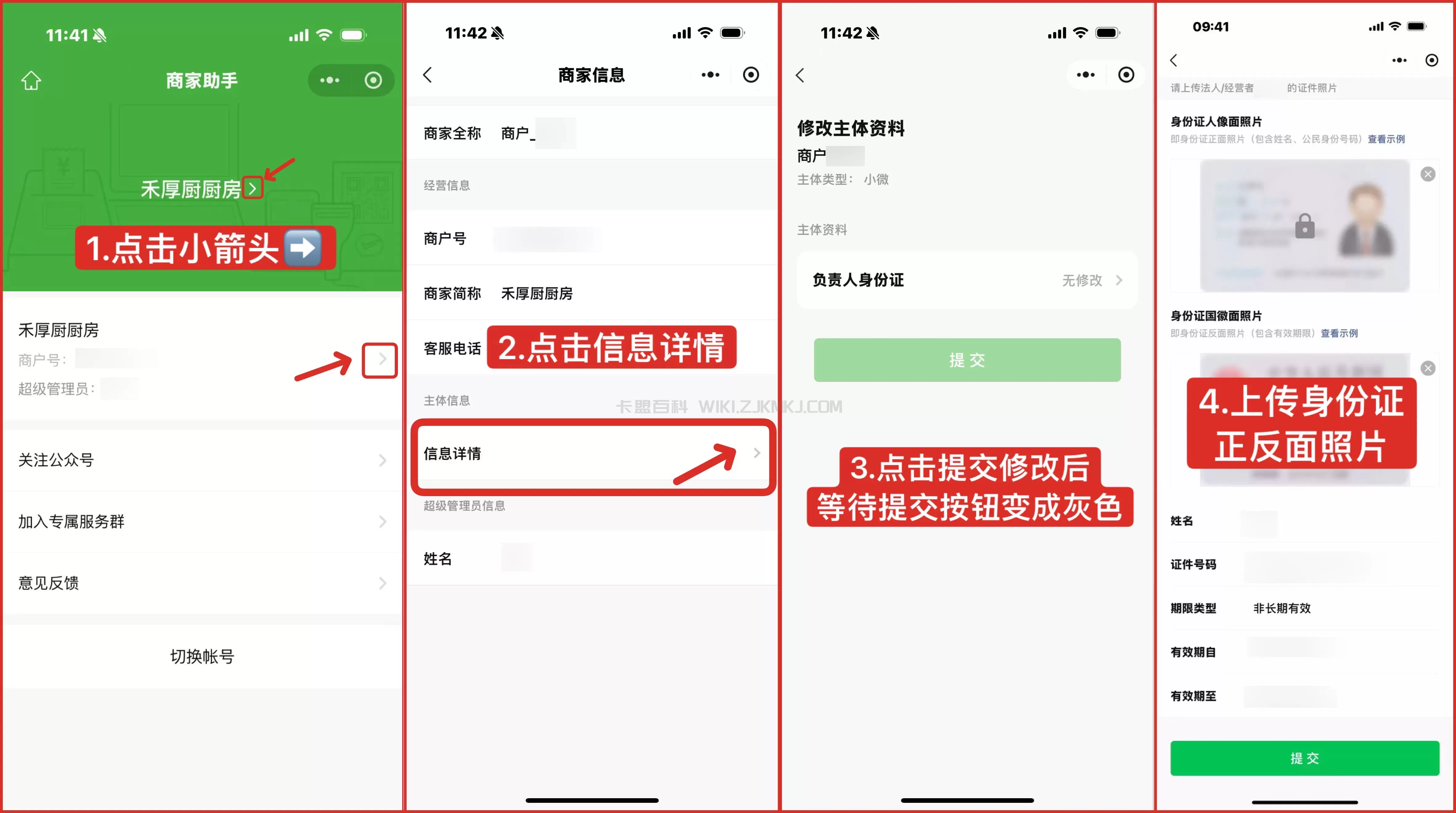 商家助手-商户名称右侧小箭头-信息详情-提交修改-上传身份证正反面照片