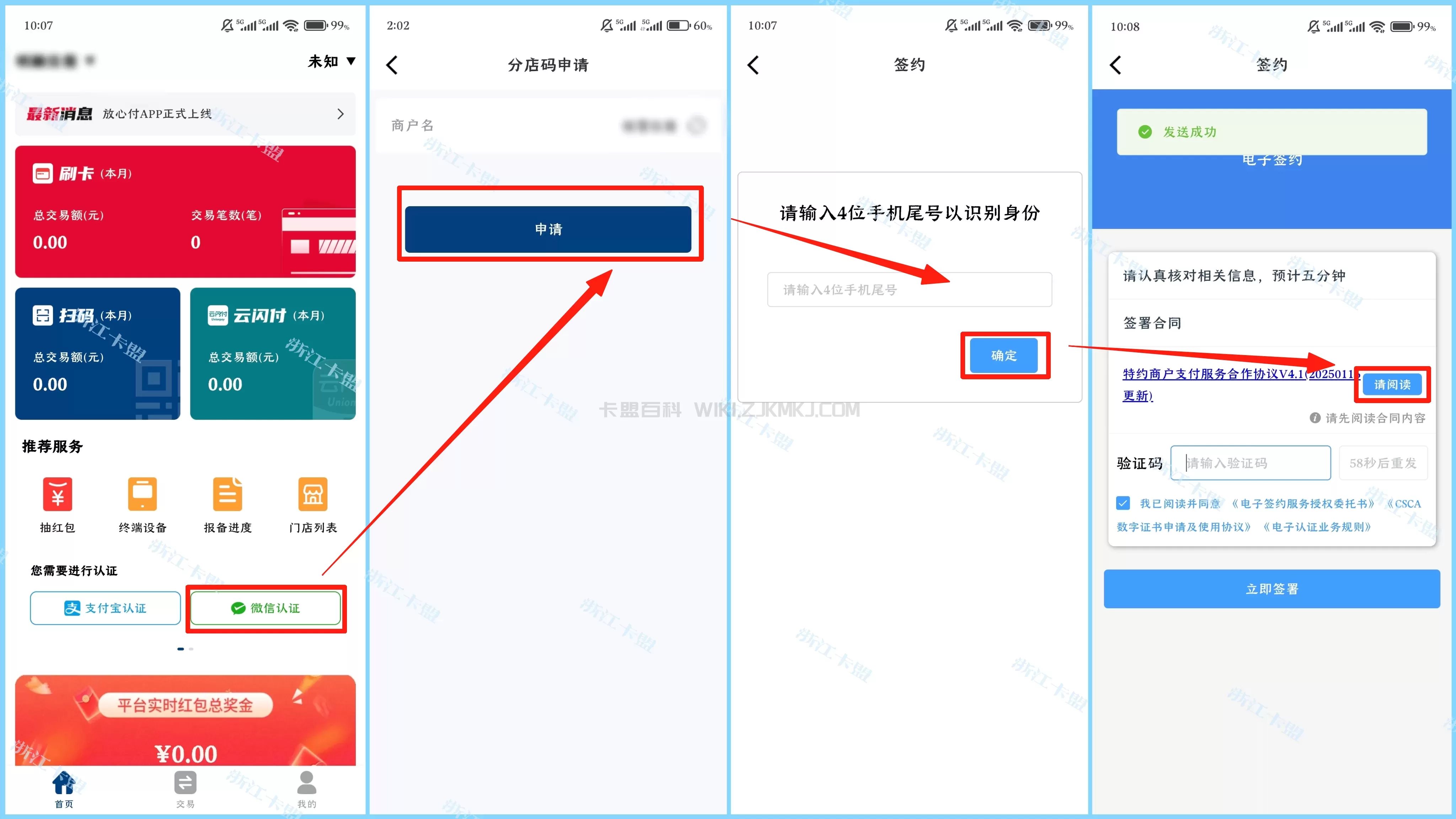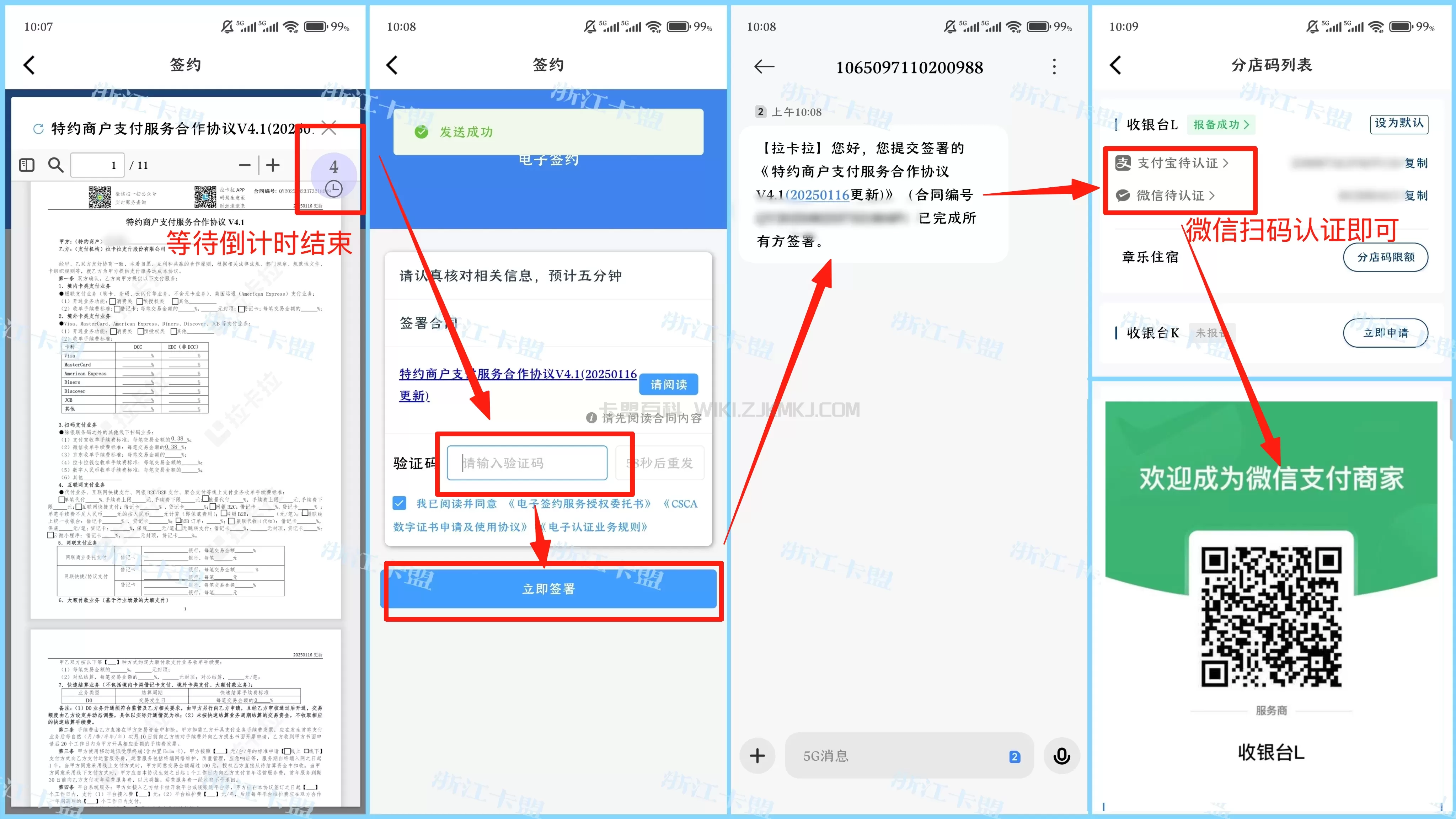 第二步: 阅读合约-输入验证码-立即签署-报备成功-微信扫码关联商户
