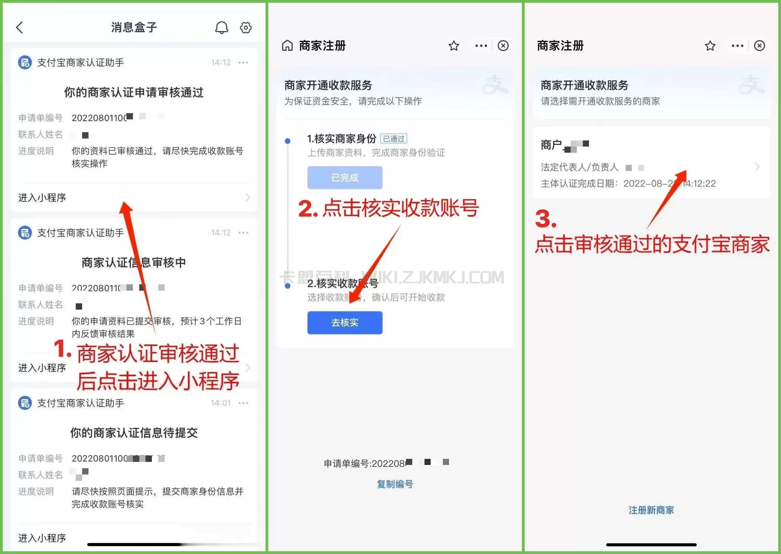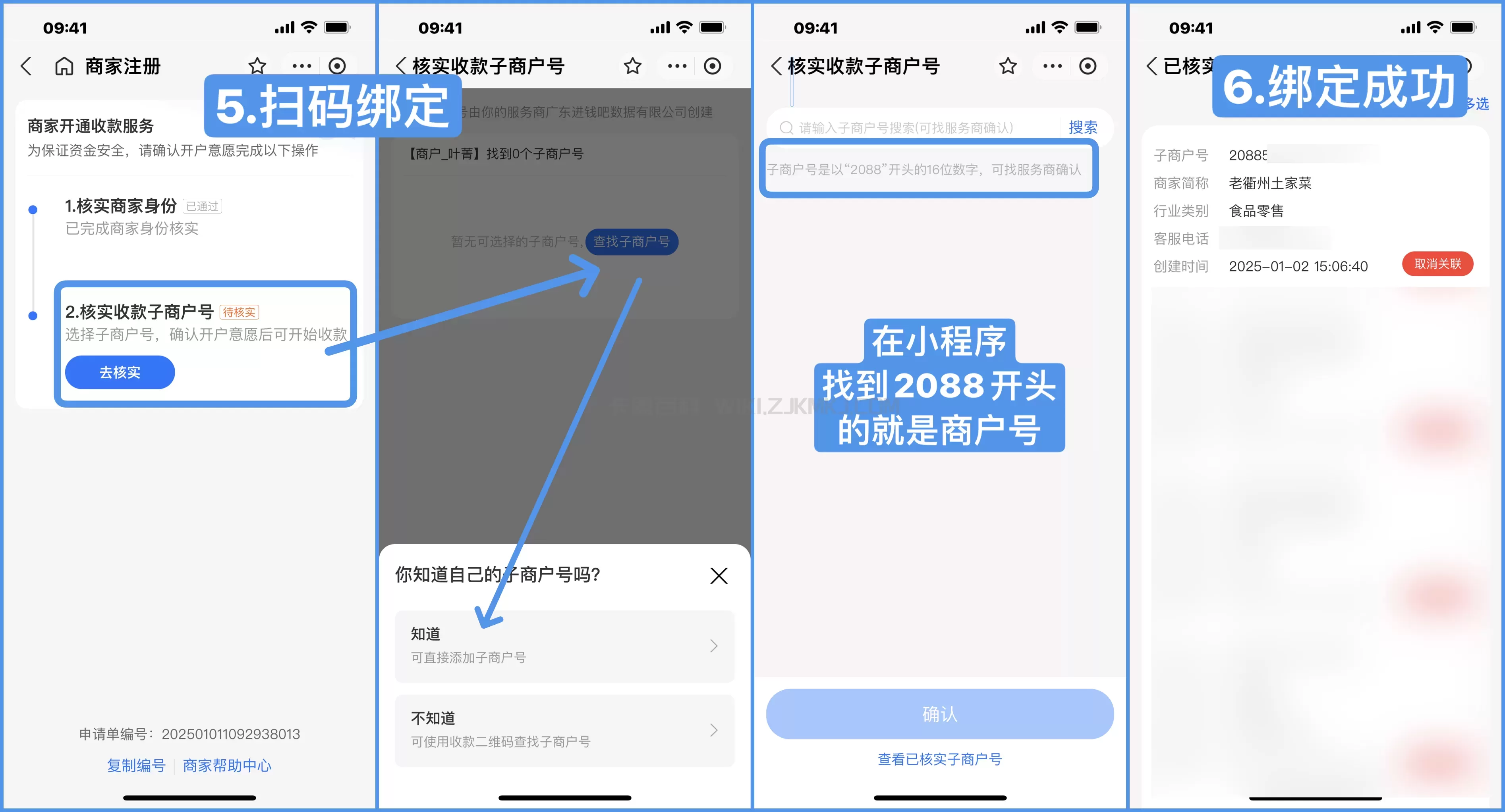 收到审核通过通知后,点击通知打开链接,点击去核实,输入第一步获取的子商户号,绑定即可