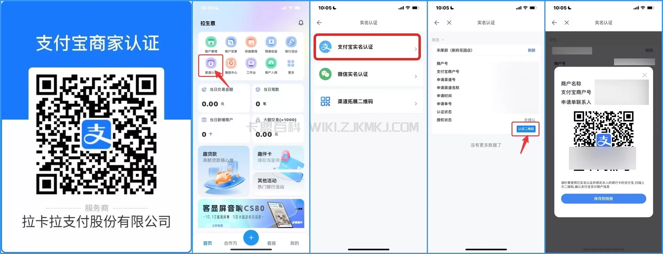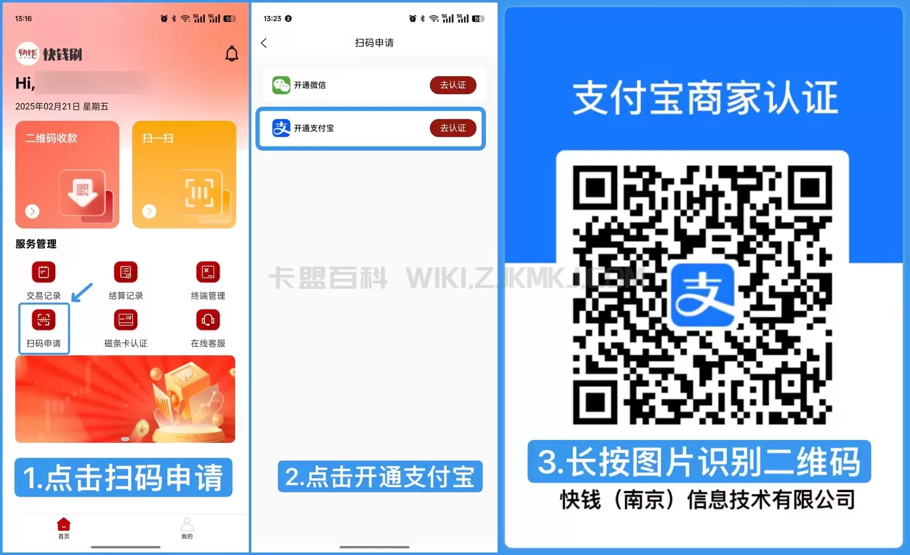 快钱刷APP-扫码申请-开通支付宝-长按图片识别二维码-查看商户-核实商户号-进行认证商户
