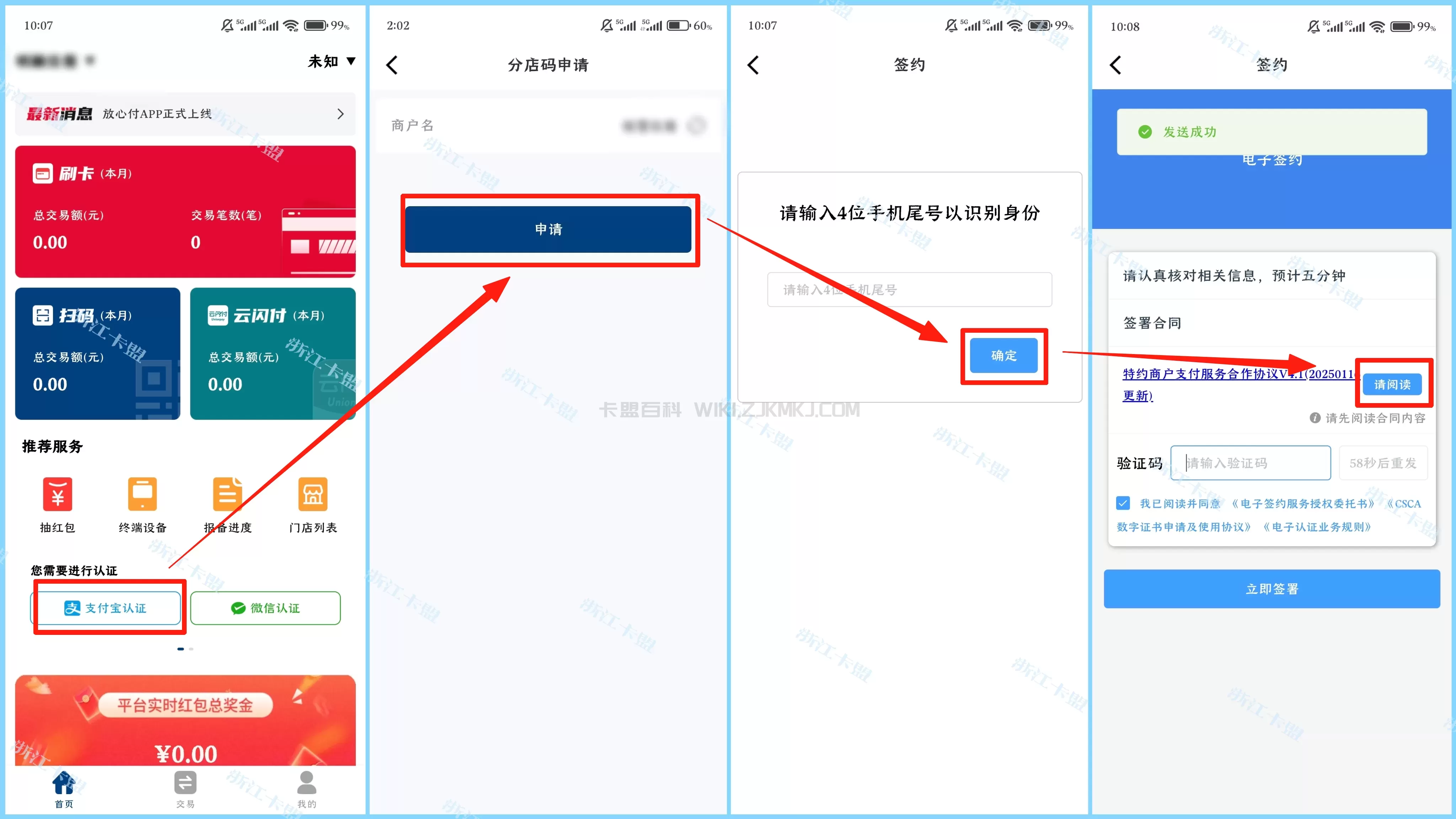 第一步: 👉放心付APP首页-支付宝认证-申请分店码-输入手机号后四位