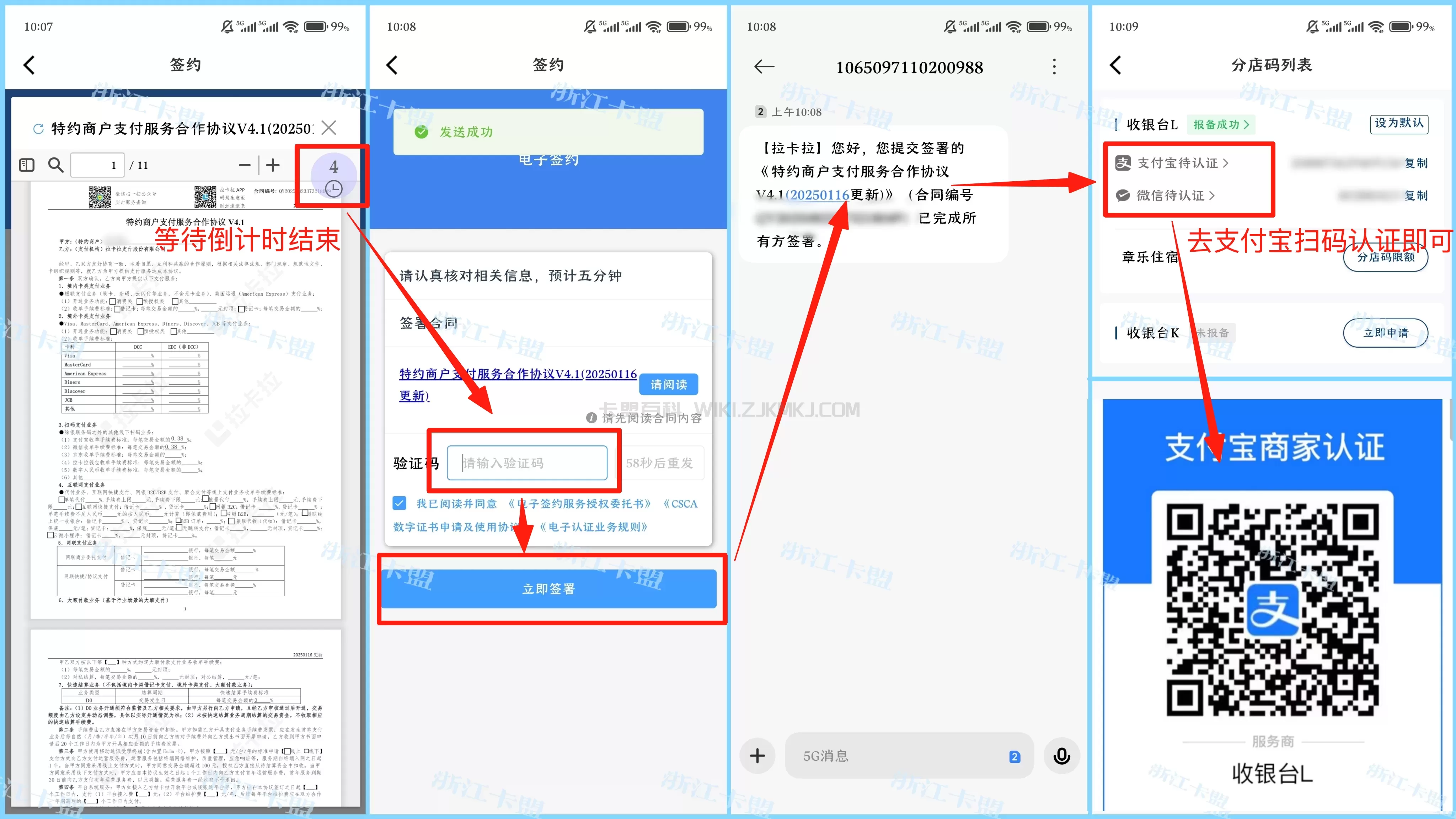 第二步: 阅读合约-输入验证码-立即签署-报备完成-支付宝扫码关联商户