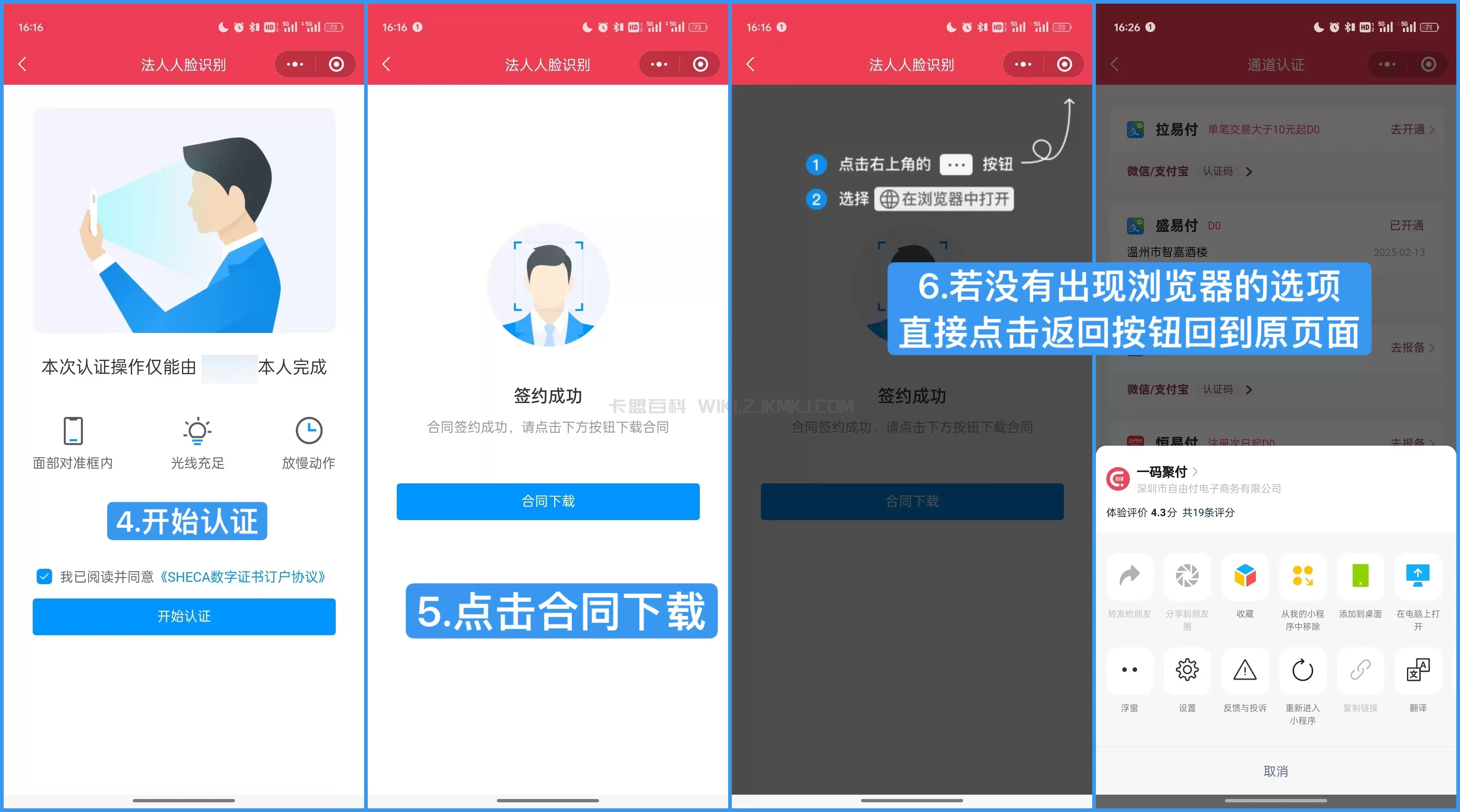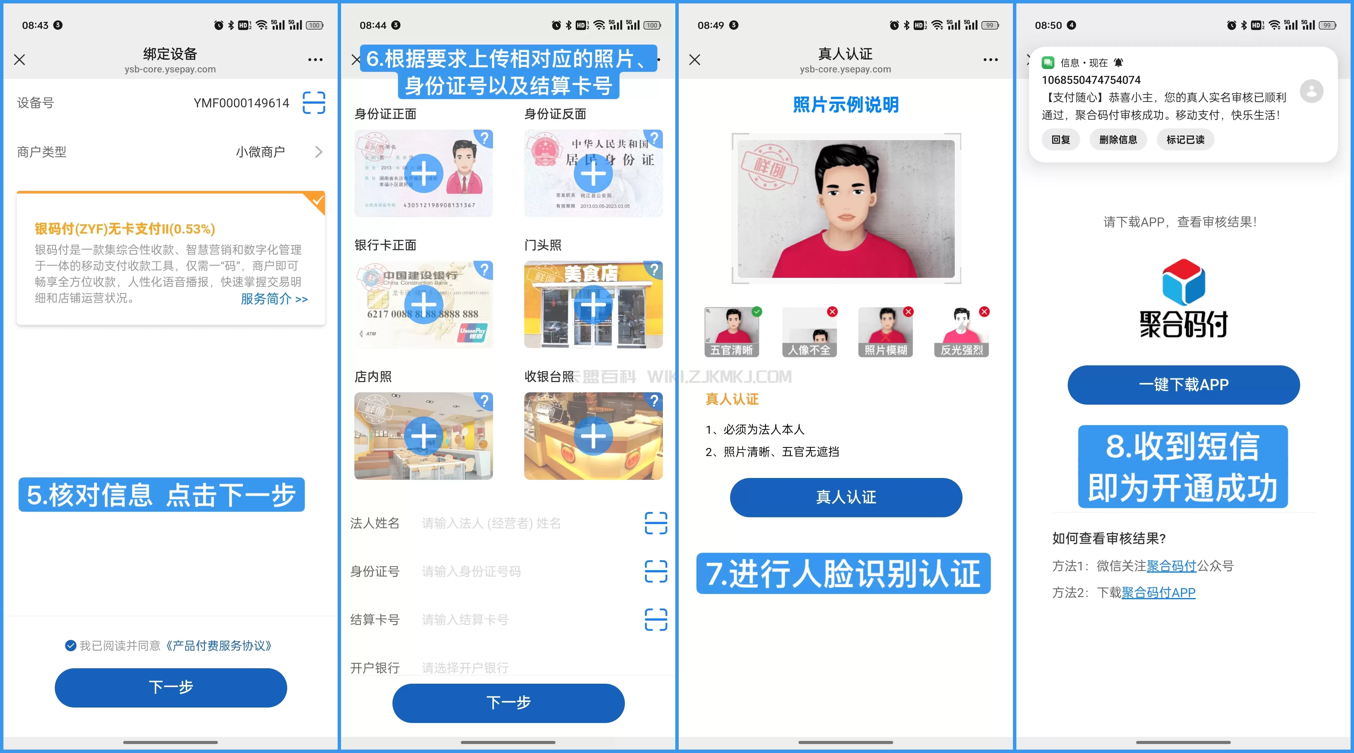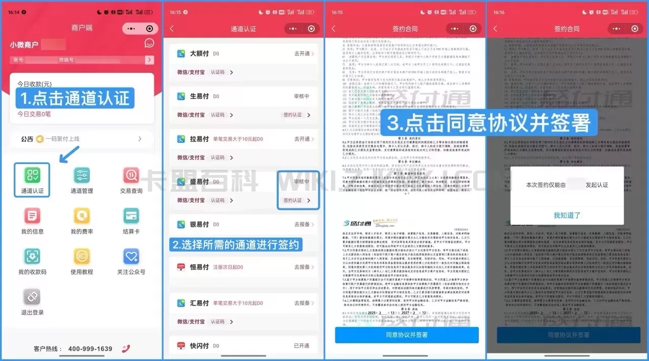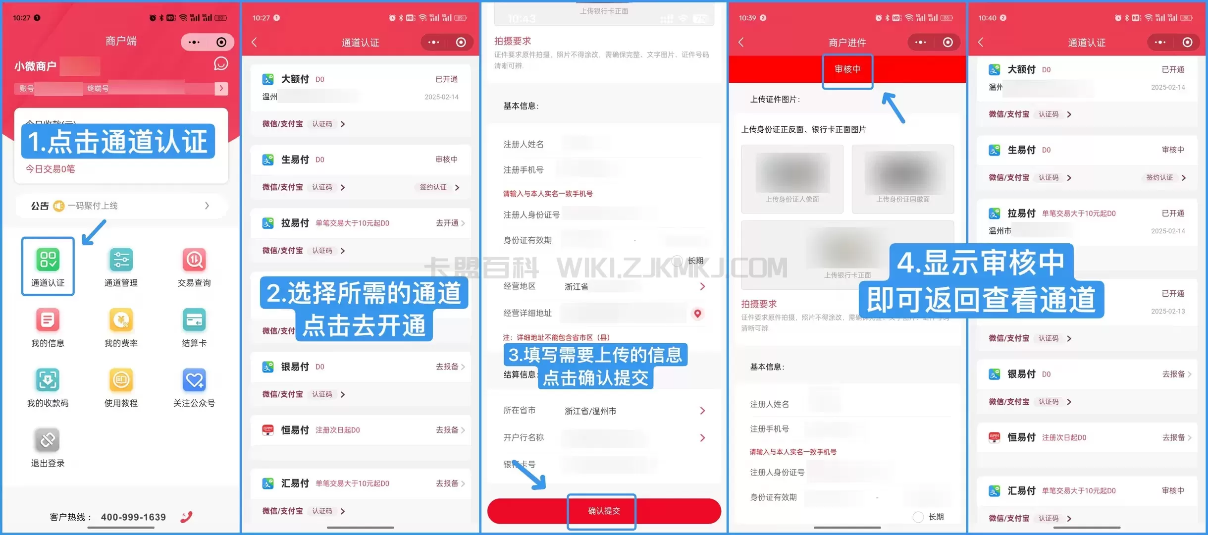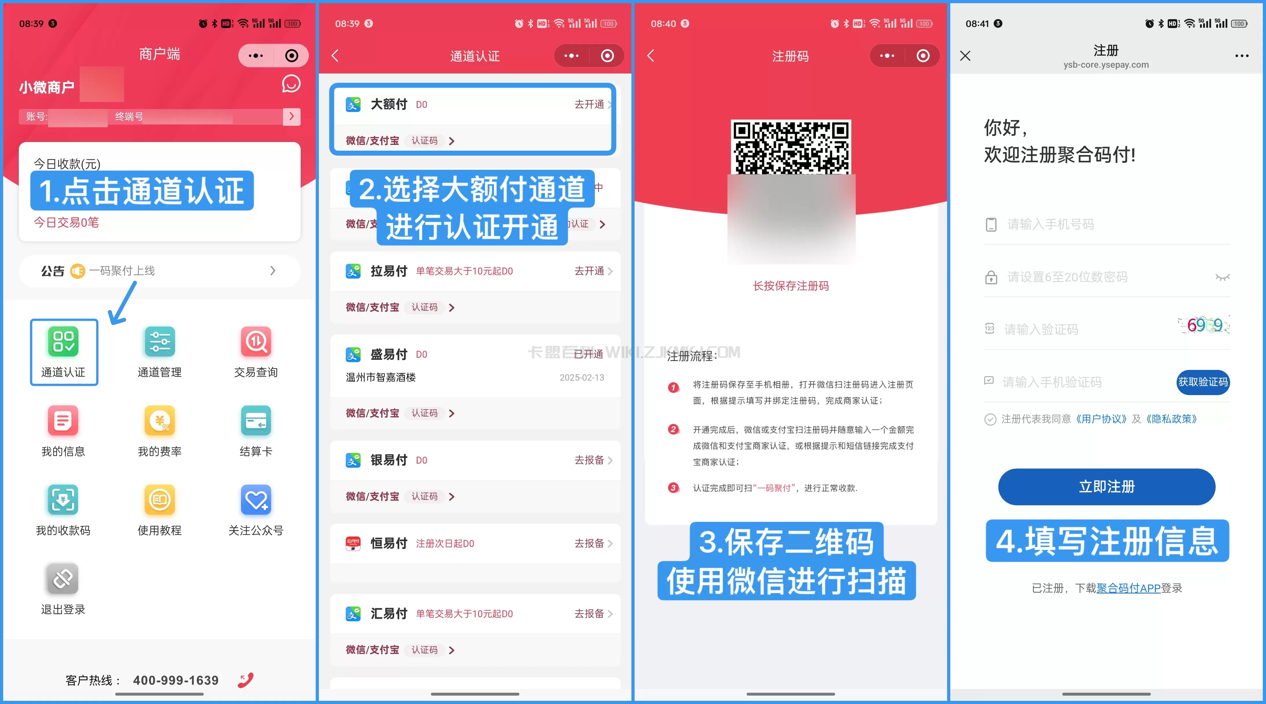 通道认证-选择 大额付通道-保存二维码使用微信扫描-填写注册信息-核对信息-上传 身份证正反面、身份证号、结算卡号-人脸识别